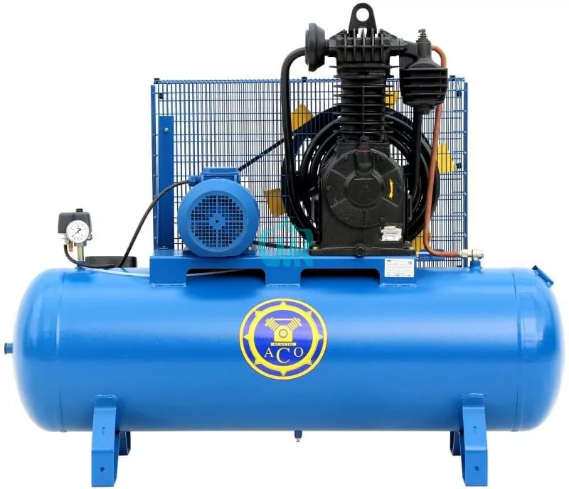 Поршневой компрессор стационарного типа С415М5/7 Бежецкого завода АСО с компрессорной головкой С415М производительностью 1300 л/мин, производительность по нагнетанию 1000 л/мин. Электродвигатель мощностью 7,5 кВт напряжением 380 В. Максимальное давление 7 атм. Реле давления Condor MDR. Горизонтальный воздушный ресивер имеет объем 230 л. Размеры 165 х 70 х 140 см, масса 300 кг.
